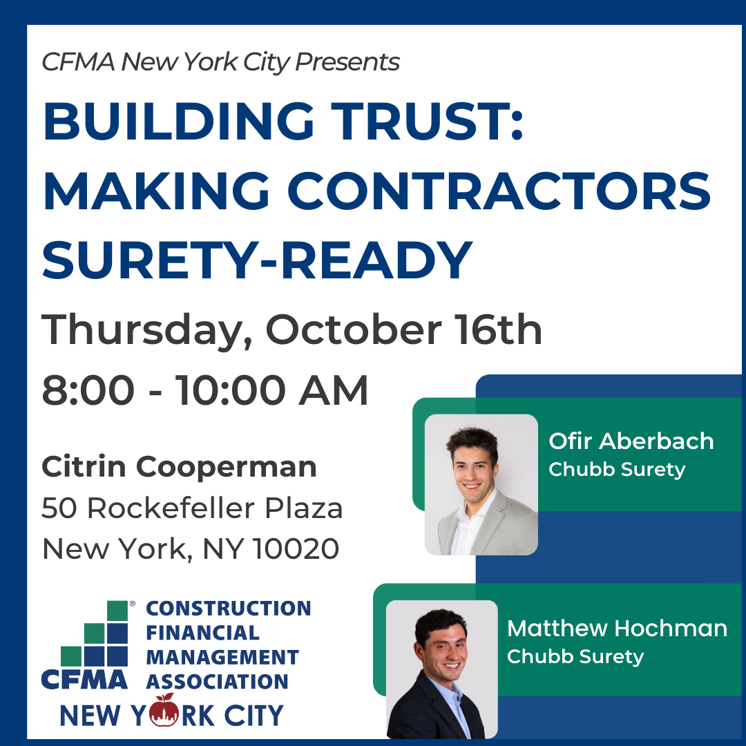 Join CFMA NYC for breakfast and a roundtable discussion on what it takes for contractors to become “surety-ready.” Ofir Aberbach and Matthew Hochman from Chubb Surety will explore the qualities and practices that make contractors stand out to sureties, accountants, and legal advisors. From financial stability to relationship management and strategic planning, attendees will gain practical insights into how contractors can position themselves as trustworthy and low-risk partners.